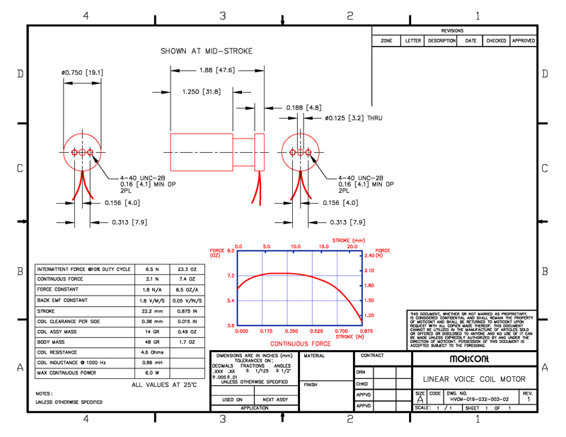 Continuous Force: 7.4 oz (2.1 N), Stroke: 0.875 in (22.2 mm), Aperture: 3.2 mm