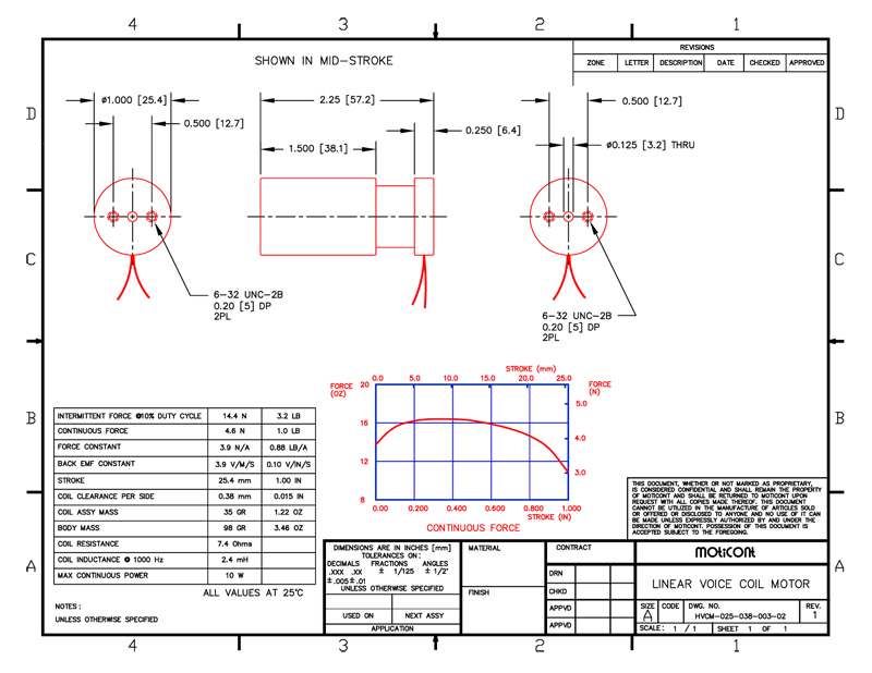 Continuous Force: 1.0 lb (4.6 N), Stroke: 1.000 in (25.4 mm), Aperture: 3.2 mm