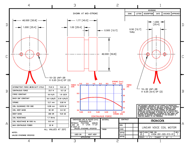 cogging, zero backlash. The HVCM-051-025-013-01 Linear actuator has a hollow core that allows for optics, illumination, laser beams, or cables to pass through. Additionally, it has a continuous force rating of 5.3 lbs (23.7 N) and a peak force of 16.9 lbs (74.8 N) at a 10% duty cycle. This compact voice coil actuator measuring just 2.000 in. (50.8 mm) dia. by 1.00 in. (25.4 mm) housing length with a 0.50 in. (12.7 mm) stroke is ideal for applications such as: Medical diagnostics and testing, laser beam steering, wafer handling, laser cutting and welding, dynamic vibration absorption, optical focusing, scanning, assembly, and positioning applications. Two 10-32 UNF-2B x 0.25 in. (6.4 mm) deep threaded mounting holes on 1.000 in. (25.4 mm) centers in the housing and coil allows for flexible and easy integration into new and existing applications. |