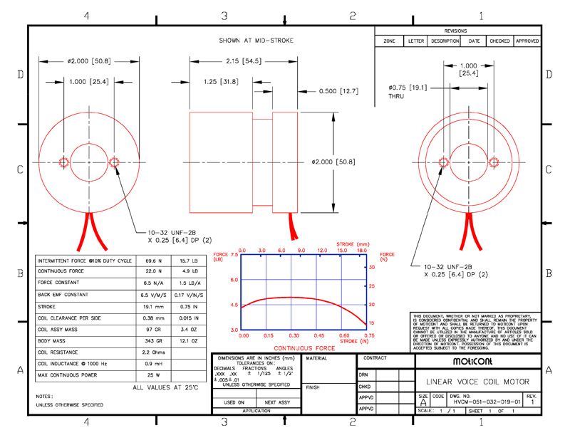 | Metric Model # | Stroke | Continuous Force | Intermittent Force @ 10% Duty Cycle | Housing Length | Through Hole Dia. | |||||