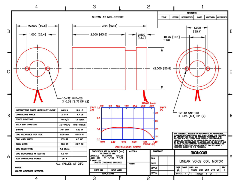 | Model # | Stroke | Continuous Force | Intermittent Force @ 10% Duty Cycle | Housing Length | Through Hole Dia. | |||||