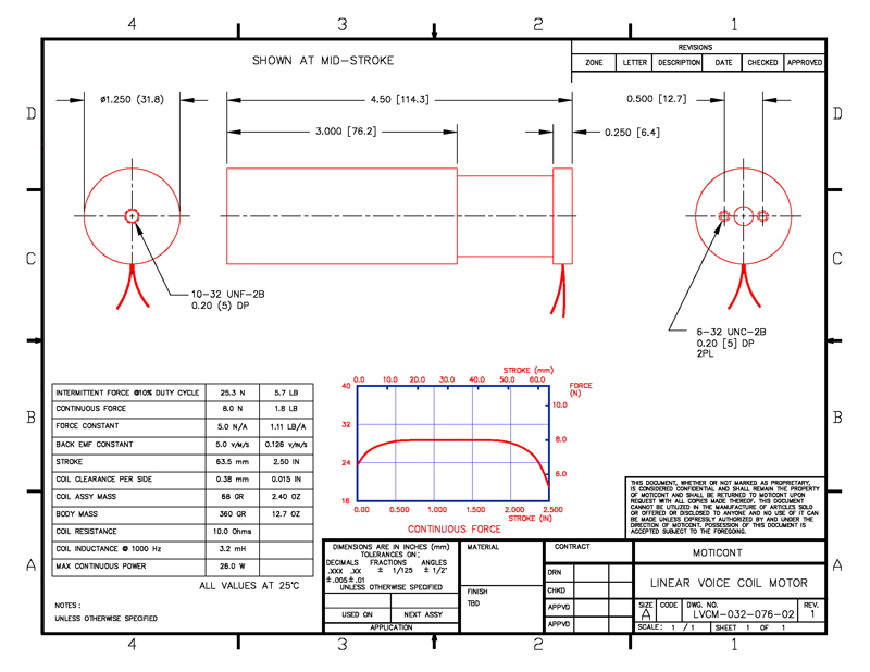 Linear Voice Coil Motor Actuator LVCM-032-076-02, Continuous Force: 1.8 lb (8.0 N), Stroke: 2.50 in (63.5 mm)