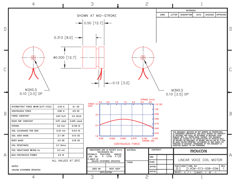 Linear Voice Coil Motor Actuator LVCM-013-008-02, Continuous Force: 2.9 Oz (0.80 N), Stroke: 0.125 in (3.2 mm)
