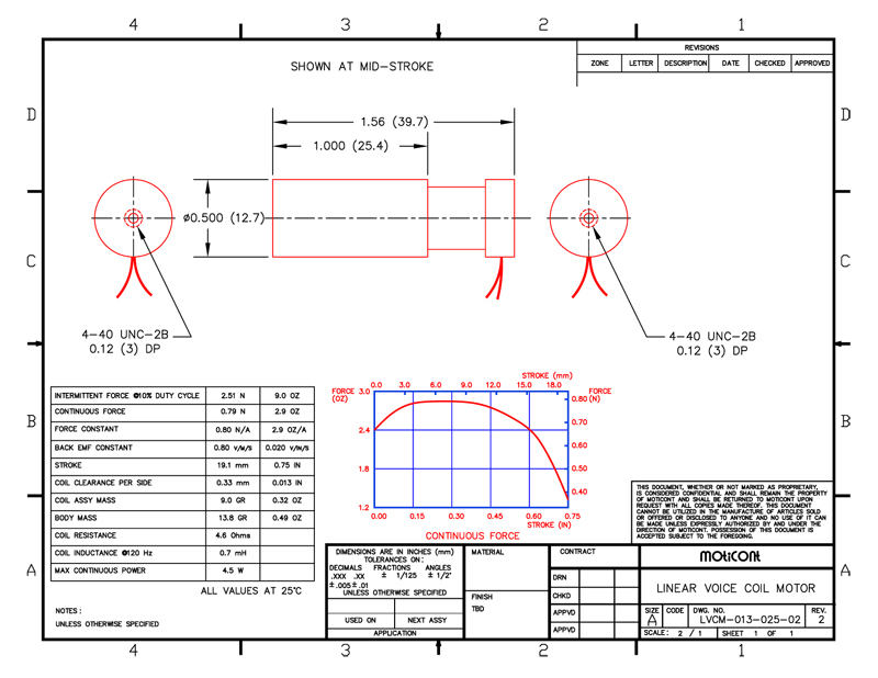 Linear Voice Coil Motor Actuator LVCM-013-025-02, Continuous Force: 2.9 Oz (0.79 N), Stroke: 0.75 in (19.1 mm)
