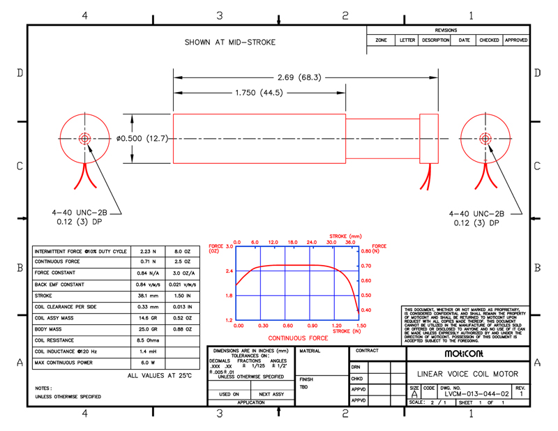 Linear Voice Coil Motor Actuator LVCM-013-044-02, Continuous Force: 2.5 Oz (0.71 N), Stroke: 1.50 in (38.1 mm)