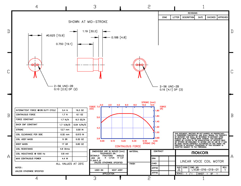 Linear Voice Coil Motor Actuator LVCM-016-019-01, Continuous Force: 6.1 Oz (1.7 N), Stroke: 0.50 in (12.7 mm)