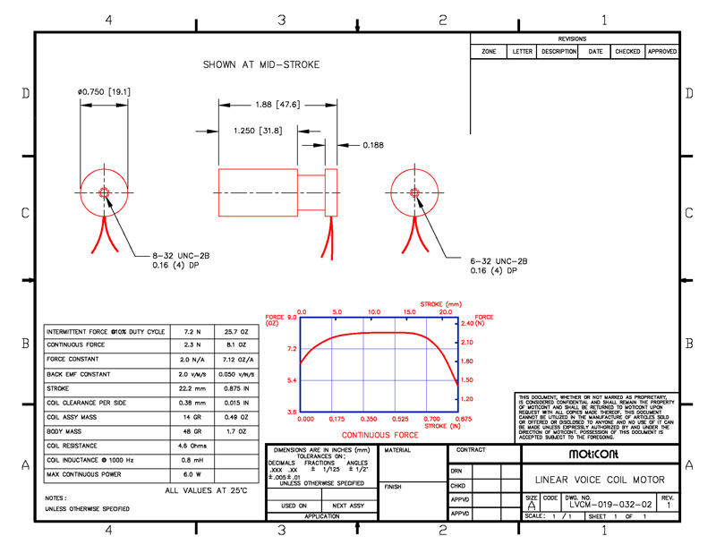 Linear Voice Coil Motor Actuator LVCM-019-032-02, Continuous Force: 8.1 Oz (2.3 N), Stroke: 0.875 in (22.2 mm)