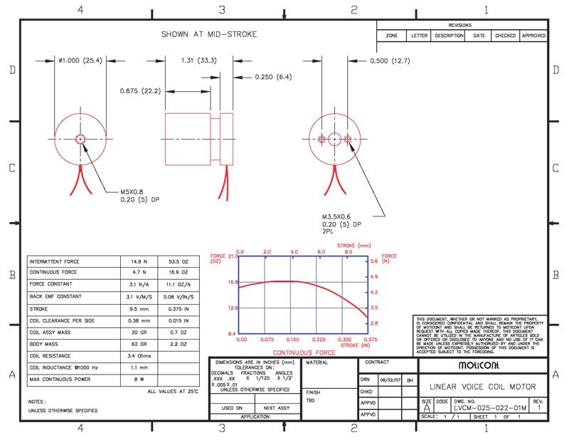 Linear Voice Coil Motor Actuator LVCM-025-022-01, Continuous Force: 16.9 Oz (4.7 N), Stroke: 0.38 in (9.5 mm)