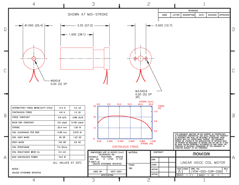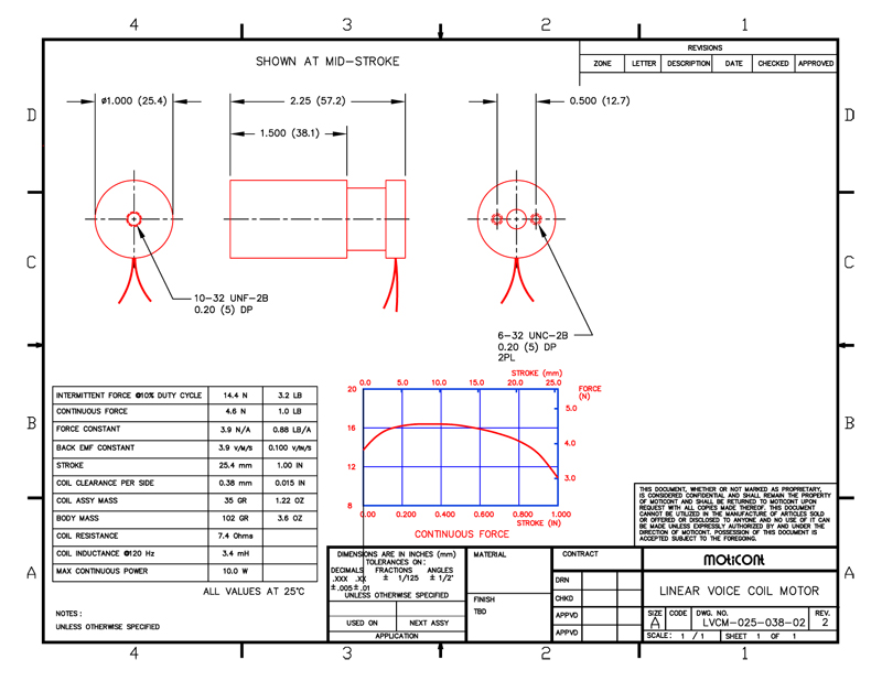 Linear Voice Coil Motor Actuator LVCM-025-038-02, Continuous Force: 16.4 Oz (4.6 N), Stroke: 1.00 in (25.4 mm)