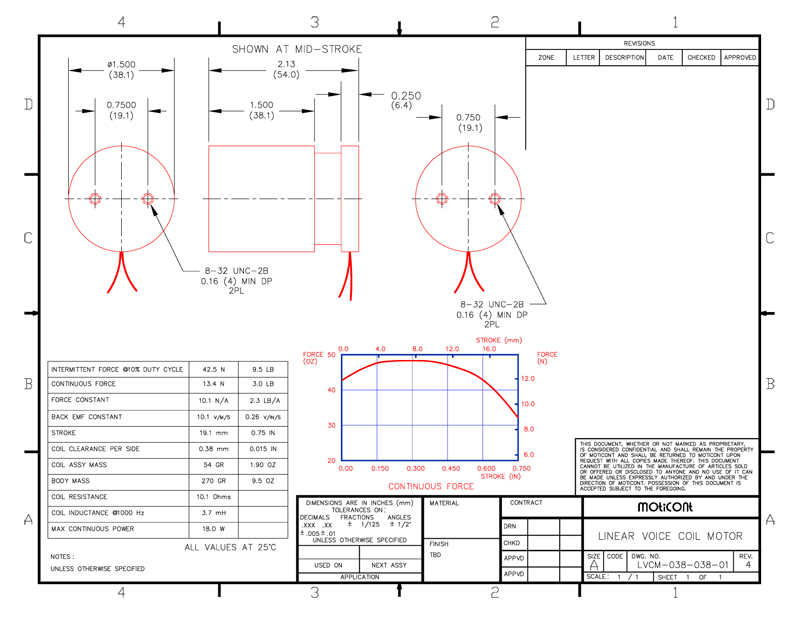 Linear Voice Coil Motor Actuator LVCM-038-038-01, Continuous Force: 3.0 lb (13.4 N), Stroke: 0.75 in (19.1 mm)