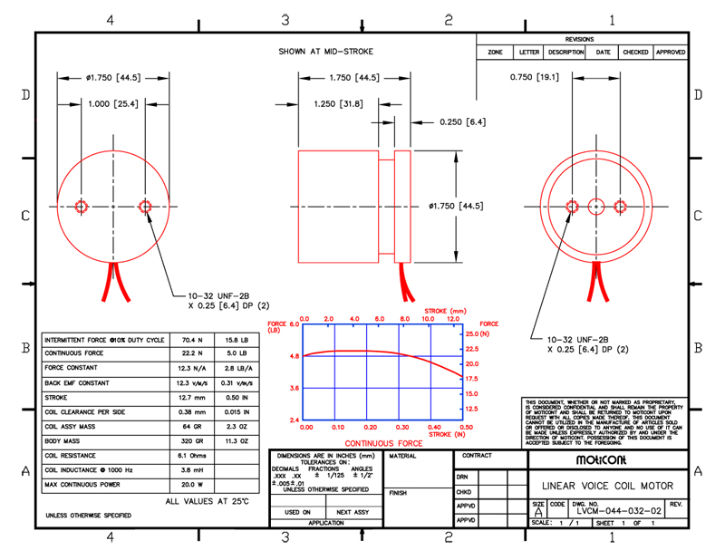 Linear Voice Coil Motor Actuator LVCM-044-032-02, Continuous Force: 5.0 lb (22.2 N), Stroke: 0.50 in (12.7 mm)