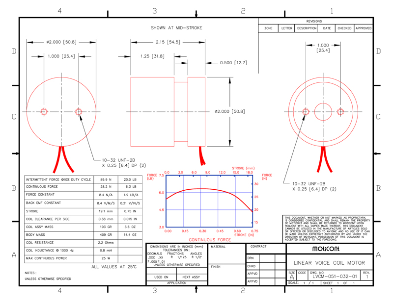 Linear Voice Coil Motor Actuator LVCM-051-032-01, Continuous Force: 6.3 lb (28.2 N), Stroke: 0.75 in (19.1 mm)