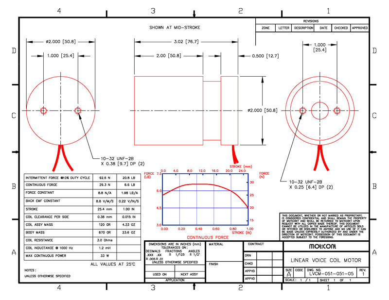 Linear Voice Coil Motor Actuator LVCM-051-051-05, Continuous Force: 6.6 lb (29.3 N), Stroke: 1.00 in (25.4 mm)