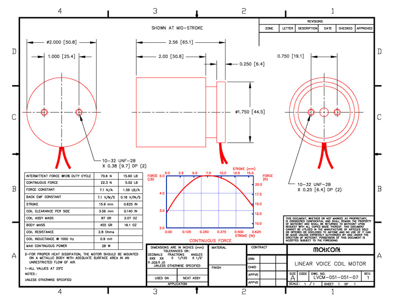 Linear Voice Coil Motor Actuator LVCM-051-051-07, Continuous Force: 5.02 lb (22.3 N), Stroke: 0.625 in (15.9 mm)