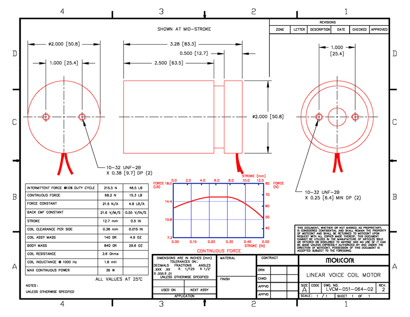 Linear Voice Coil Motor Actuator LVCM-051-064-02, Continuous Force: 15.3 lb (68.2 N), Stroke: 0.50 in (12.7 mm)