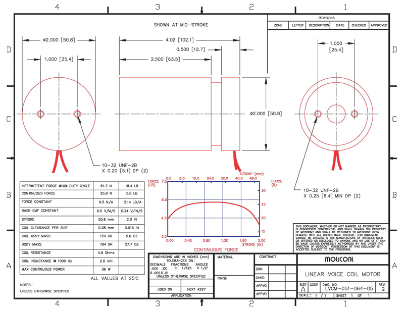 Linear Voice Coil Motor Actuator LVCM-051-064-05, Continuous Force: 5.8 lb (25.8 N), Stroke: 2.00 in (50.8 mm)