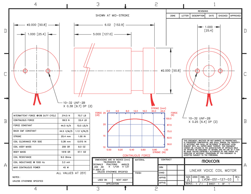 Linear Voice Coil Motor Actuator LVCM-051-127-03, Continuous Force: 22.4 lb (99.5 N), Stroke: 1.00 in (25.4 mm)