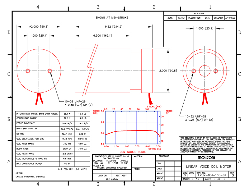 Linear Voice Coil Motor Actuator LVCM-051-165-01, Continuous Force: 4.8 lb (21.5 N), Stroke: 5.25 in (133.4 mm)