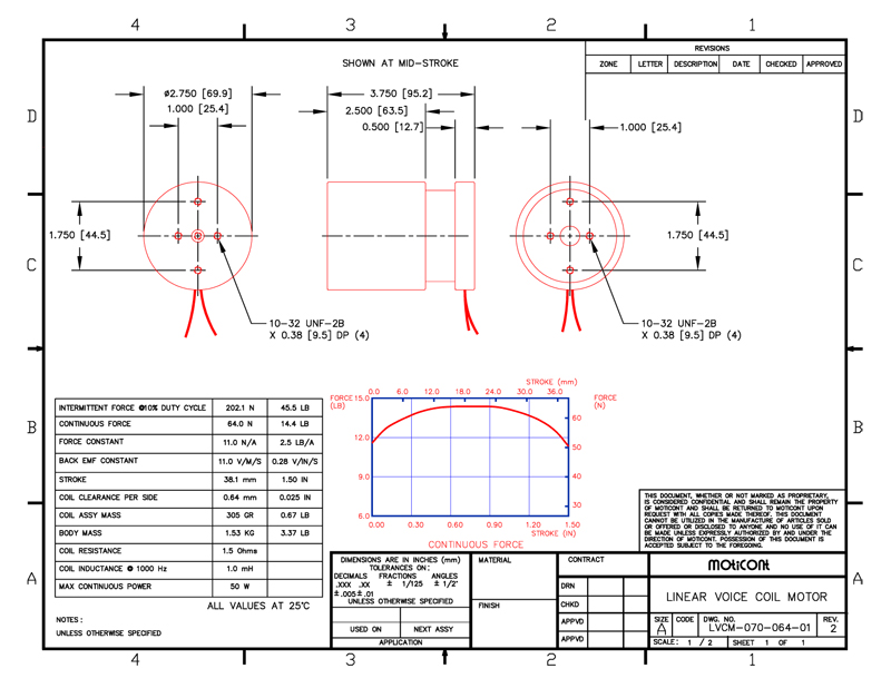 Linear Voice Coil Motor Actuator LVCM-070-064-01, Continuous Force: 14.4 lb (64.0 N), Stroke: 1.50 in (38.2 mm)