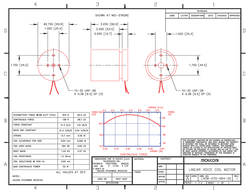 Linear Voice Coil Motor Actuator LVCM-070-064-02, Continuous Force: 28.7 lb (128 N), Stroke: 0.50 in (12.7 mm)
