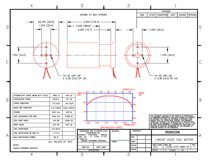 Linear Voice Coil Motor Actuator LVCM-070-089-01, Continuous Force: 14.1 lb (62.8 N), Stroke: 2.50 in (63.5 mm)