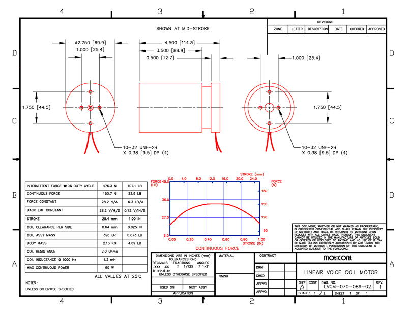 Linear Voice Coil Motor Actuator LVCM-070-089-02, Continuous Force: 33.9 lb (150.8 N), Stroke: 1.00 in (25.4 mm)