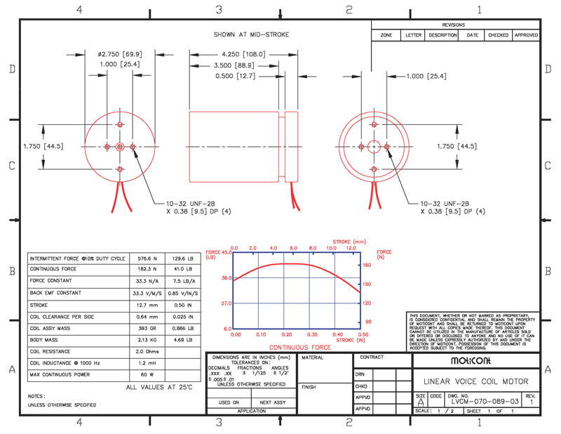 Linear Voice Coil Motor Actuator LVCM-070-089-03, Continuous Force: 41.0 lb (182.3 N), Stroke: 0.50 in (12.7 mm)
