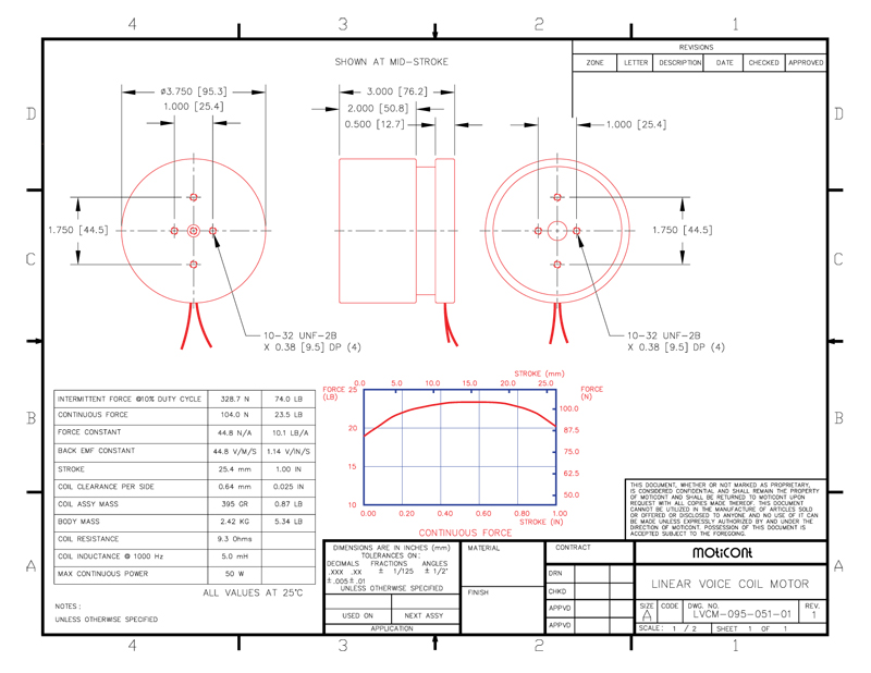 Linear Voice Coil Motor Actuator LVCM-095-051-01, Continuous Force: 23.4 lb (104.0 N), Stroke: 1.00 in (25.4 mm)