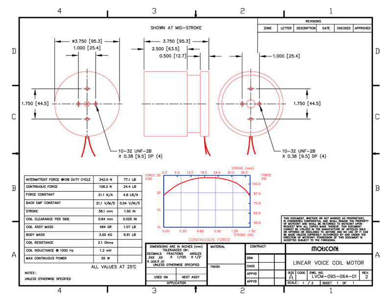 Linear Voice Coil Motor Actuator LVCM-095-064-01, Continuous Force: 24.4 lb (108.2 N), Stroke: 1.50 in (38.2 mm)