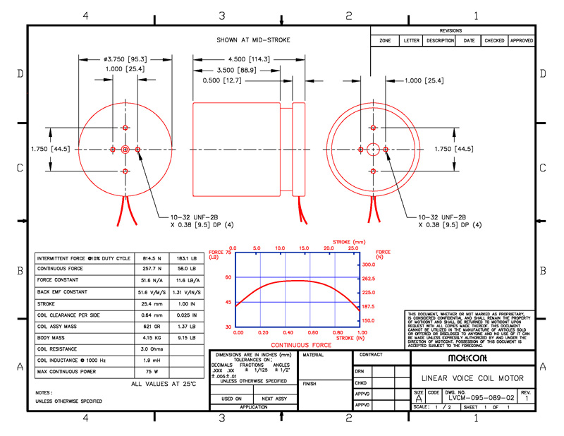 Linear Voice Coil Motor Actuator LVCM-095-089-02, Continuous Force: 58.0 lb (257.7 N), Stroke: 1.00 in (25.4 mm)
